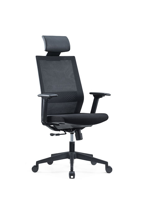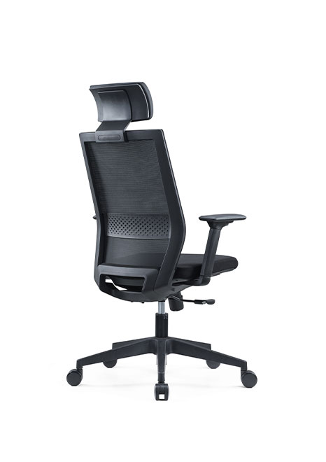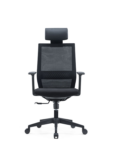 DOSSIER: In black mesh with adjustable lumbar support SIÈGE: Molded foam BASE: Pyramide noire MÉCANISME: Synchronisé avec le réglage de la profondeur d'assise BRAS: 3D noir