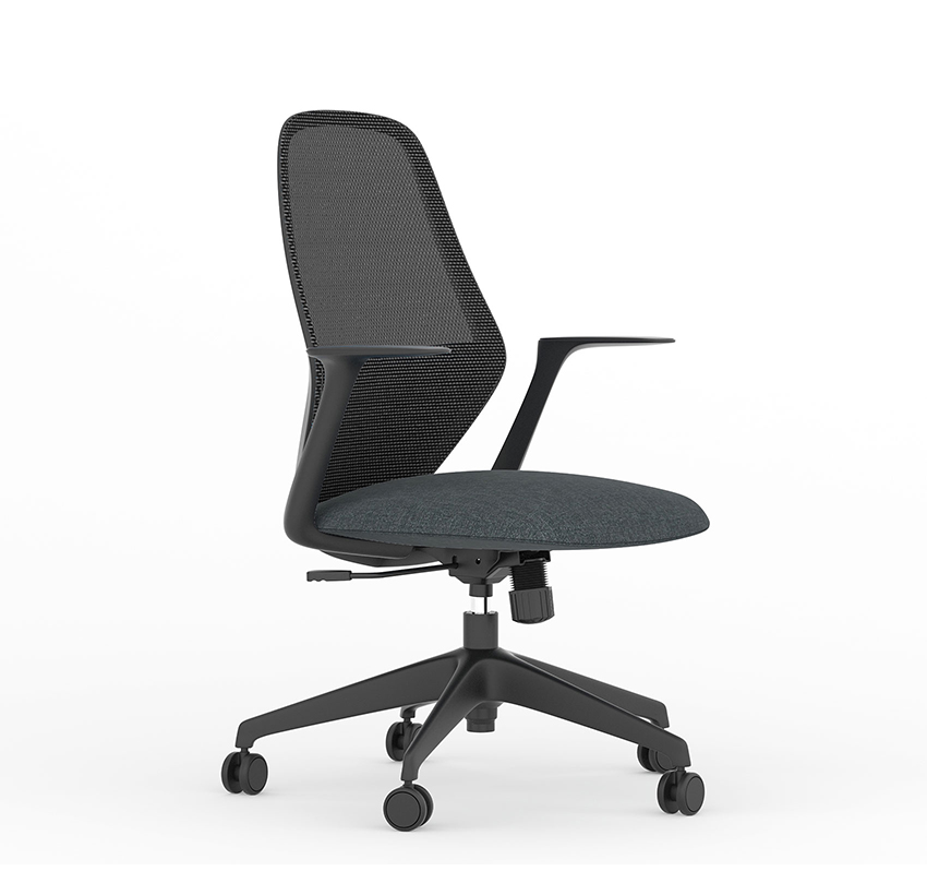 DOSSIER: Moyen en filet gris foncé ASSISE: Rembourré en tissu gris BASE: Ronde noire BRAS: Fixes MÉCANISME: Syncron ÉLÉVATION: Gaz APPUI: Lombaire réglable